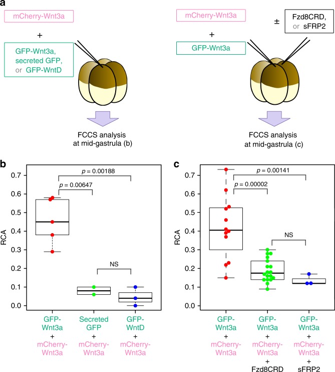 Fig. 5. Fluorescence Cross-Correlation Spectroscopy (FCCS) analysis of Wnt3a in the extracellular milieu in Xenopus embryos. a FCCS analyses of the extracellular milieu within almost one-cell diameter from Wnt3a-expressing cells were carried out in Xenopus embryo at the mid-gastrula stage. Through a number of trials of FCCS and FCS (Fig. 6) analyses, we found that the behavior of Wnt proteins was quite different between the inside and outside of cells. Thus, we could ensure the extracellular measurements by examining the dynamics of Wnt proteins. b Molecular interaction between mCherry-Wnt3a and GFP-Wnt3a, secreted GFP or GFP-WntD is evaluated with RCA (relative cross-correlation amplitude), which corresponds to the ratio of interacting molecules to all molecules. c Effects of overexpression of Fzd8-CRD or sFRP2 on molecular interaction between mCherry-Wnt3a and GFP-Wnt3a. Statistical significance (p) was calculated by use of Tukeyâs multiple comparisons of means. NS means not significant |