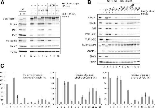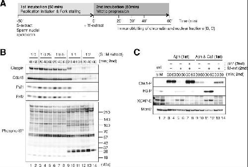 Fig. 1. Mitotic entry drives replisome disassembly at stalled replication forks. (A) Schematic diagram of experimental design. Sperm nuclei (5000/μL) were incubated for 60â¯min in S-phase egg extract (S-extract) with 10â¯Î¼g/mL aphidicolin followed by addition of M-phase egg extract (M-extract) and incubation for up to 60â¯min. (B) Chromatin fractions (from 1â¯Ãâ¯105 nuclei) were isolated at the indicated time and subjected to immunoblotting to examine chromatin binding of replisome factors and the phosphorylation status at Ser-Pro sequences of chromatin-bound proteins after adding M-extract to 20â¯Î¼L of S-extract at the indicated ratio (0, 5, 10, 20, and 40â¯Î¼L). (C) The nuclear fractions (1â¯Ãâ¯105 nuclei) were isolated at the indicated time and subjected to immunoblotting to examine the phosphorylation of Chk1 (Ser344) and Histone H3 (Ser10). An equal 0.5â¯Î¼L volume of S-phase and M-phase extract was loaded for comparison (lane 1, 2).