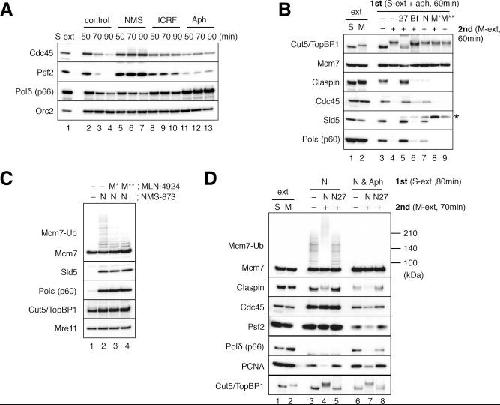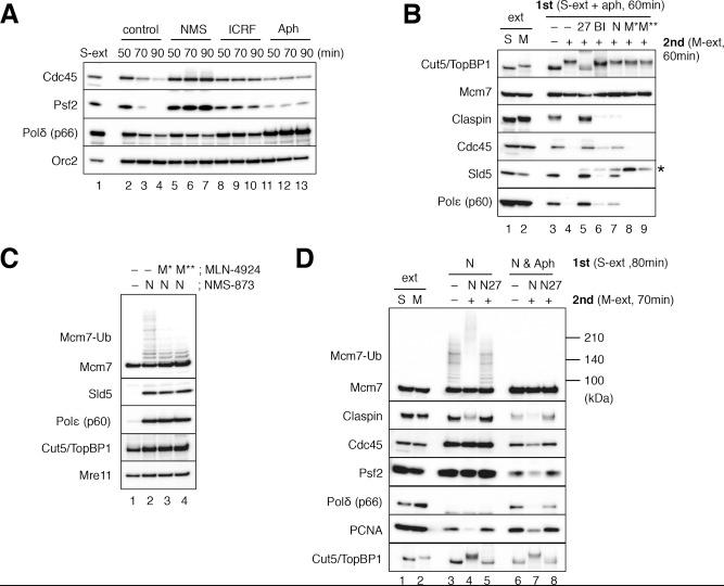 Fig. 3. Replisome disassembly in M-phase is mechanistically distinct from that of replication termination in S-phase. (A) Sperm nuclei (5000/μL) were incubated in 20â¯Î¼L of S-phase extract for the indicated time in the presence or absence of NMS-873 (NMS, 100â¯Î¼M), ICRF-193 (ICRF, 100â¯Î¼M), or aphidicolin (Aph, 10â¯Î¼g/mL). A small amount (0.5â¯Î¼L) of extract (S-ext, lane 1) and the isolated chromatin fractions (lane 2â13) were subjected to immunoblotting. (B) The same experiment as in Fig. 2A was performed in the presence or absence of His-p27 (27, 140 μg/mL), BI2536 (BI, 10 μM), NMS-873 (N, 100 μM), or MLN-4924 (M* 5 μM, M** 10 μM). Asterisk, non-specific band. (C) The same experiment as in (A) was performed with MLN-4924 (M* 5 μM, M** 10 μM) or NMS-873 (N, 100 μM) supplemented as indicated. The chromatin fractions were isolated after a 100 min incubation and subjected to immunoblotting. (D) A similar experiment as in Fig. 2A was performed with NMS-873 (N, 100â¯Î¼M), aphidicolin (Aph, 10â¯Î¼g/mL), or His-p27 (27, 140â¯Î¼g/mL) supplemented as indicated. The incubation times were 80â¯min in the 1st and 70â¯min in the 2nd incubations.