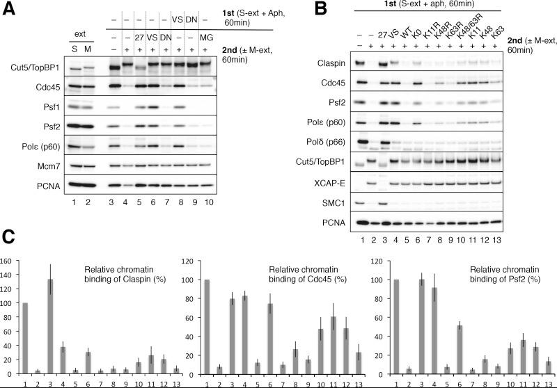 Fig. 2. Both K48- and K63-linked poly-ubiquitylation is required for mitotic replisome disassembly. (A) The requirement of CDK, ubiquitylation, SUMOylation, and proteasome activity for mitotic replisome disassembly. The same experiment as in Fig. 1B (S:Mâ¯=â¯1:1) was performed in the presence or absence of 140â¯Î¼g/mL His-p27 (27), 0.215â¯Î¼g/mL Ub-VS (VS), 400â¯Î¼g/mL GST-Ubc9-DN (DN), and 150â¯Î¼M MG132 as indicated. An equal 0.5â¯Î¼L volume of S- and M-phase extract (ext, S and M) was loaded for comparison (lane 1, 2). (B) Analysis of the ubiquitin chain required for mitotic replisome disassembly. The same experiment as in Fig. 2A was performed in the presence or absence of His-p27 (27), Ub-VS (VS), wild-type Ub (WT), and a series of Ub mutants (K0, K11R, K48R, K63R, K48/63R, K11, K48, K63). Wild-type and mutated Ubs were added at 400â¯Î¼g/mL. (C) The same experiments as in (B) were repeated three times and the signal intensities of Claspin, Cdc45, and Psf2 were quantified. The value of lane 1 (no addition of M-extract) as a control was set to 100%, and the relative average value of lane 2â13 was shown in the graphs. Error bars; ± S.D.