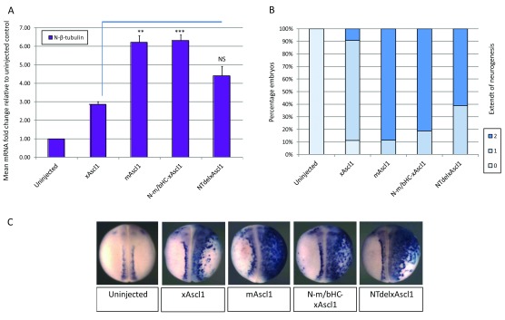 Figure 3. . Differential activity between mAscl1 and xAscl1 maps to the N terminus of the protein.Two cell stage embryos were unilaterally injected with 100pg of mRNA encoding each construct, as labelled. At stage 18, embryos were assayed for expression of N-β-tubulin relative to uninjected control embryos. (