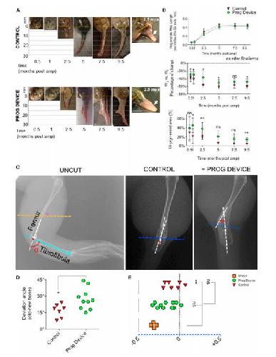 Figure 2. Gross Morphological Outcomes and Bone Reorganization Show Tendency to Pattern Formation in Animals Treated with the Combined Drug Device (A and B) Soft-tissue patterning for Ctrl (top) and Prog-device treated (bottom) animals during a 9.5-month regeneration period. (A) Amputation plane is indicated with an orange line. Lateral panels show the appearance of the regenerate at 2.5 mpa, when differences between groups become obvious. White arrows point out the typical unpigmented area covering wider regenerates. Scale bar, 1 cm. (B) Data represent the mean and SD (Ctrl group n > 6 animals for 0.52.5 mpa, n = 3 for 59.5 mpa; Prog-device group n > 6 animals for 0.59.5 mpa). p values after two-way ANOVA are indicated as *p < 0.05, **p < 0.01, ns, no significant difference. (CE) Reorganization of the regenerated bone and remaining tissues after treatment and comparisons to the naturally occurring joint formation between femur and tibiofibula bones in intact limbs. (C) Left: X-ray image of right leg of intact or uncut animals. Typical deviation angle (a, close to 90) for joint formation between femur and tibiofibula bones is indicated. An orange dashed line indicates the plane where amputation is performed. Right: X-ray images for Ctrl and Prog-device animals at 7.5 mpa, to evaluate the reintegration of the regenerated bone and remaining tissues (old bone and soft tissue) during limb regeneration (for schematic representation and axis explanation, see Figure S2B). (D) Deviation angle created by the new bone growth for Prog-device animals is significantly more open than the one for regular spikes in Ctrl or no-device animals. (E) Graph representing the old-bone displacement (d) during the course of the regeneration, from the longitudinal axis (0) to the medial edge of the soft tissue (0.5). Values are represented with scatterplots, in which each dot represents one animal. p values after t test (D) or post hoc Bonferronis test (E, p < 0.01 for oneway ANOVA) are indicated as *p < 0.05, **p < 0.01, ns, no significant difference. |