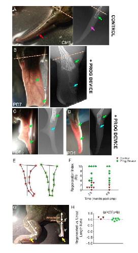 Figure 3. Instead of the Typical Spikes Formed in the Absence of Treatment, Combined ProgDevice Treated Animals Regenerate Complex Patterned Paddle-like Structures (AâD) Anatomical outcome (left) and X-ray images (right) of regenerates formed in adult Xenopus hindlimb amputation after no treatment (Ctrl, A) and after 24-hr combined treatment of drug-loaded device (Progdevice, BâD). (A) Red arrow indicates the hypomorphic cartilaginous structure, spike, lacking specialized tissues. (BâD) Green arrows on soft tissue images (left panels) indicate the dense and sprouted vascularization, easily visualized due to unpigmented epithelium covering the regenerates of treated PD7 (B), PD5 (C), and PD1 (D) animals. X-ray images (right panels) show the new bone growth within the regenerates of treated PD7 (B), PD5 (C), and PD1 (D) animals (weakly ossified bone close to the amputation plane, green arrows; nonossified bone or regenerated cartilage traveling toward the distal part, turquoise arrows in BâD; magenta arrow in A indicates the absence of bone regeneration in the distal spike). Individual identification of each animal is indicated in white (Ctrl: untreated control, PD: Progdevice treated, followed by the individual number). (E) Shape profiles, as obtained after MorphoJ software measurements (see Figure S2B for details), for untreated (red) and Prog-device treated animals (green). Each circle indicates the average position for each landmark, after computations for n = 3 and n = 7 animals in Ctrl and Prog-device groups, respectively. Quantification and statistical analysis of these shape states showed significant differences in the Mahalanobis distance (p < 0.05) for the profile of the shape of the regenerate. (F) Application of RI to regenerates at both 2.5 and 9.5 mpa (two-way ANOVA, p < 0.01 for ââgroupââ factor). Scatterplots are presented in which each dot represents one animal. (G and H) Quantification of regenerated limb length (a0 + b0 ) relative to uncut limbs (a + b) revealed that the regenerating hindlimb stops growing at a point at which, under normal growth conditions, the animalâs digits appear (yellow arrows) (G). Values in (H) are represented with scatterplot, in which each dot represents one animal |