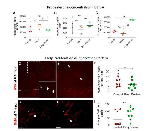 Supplementary Fig. S1. Early response to device attachment: Progesterone levels and proliferation & innervation patterns, Related to Figure 1. A-C. Progesterone levels in the three experimental groups 24 hours after amputation and device attachment, measured via ELIA both at remote tissues (A&B, blood and brain) and at injury site (C, blastema). Control (untreated after amputation), Sham (only-device treated after amputation) and Prog-device (combined progesterone-loaded device treated after amputation) animals are represented in red, orange and green, respectively. Values are represented with scatter plots, where each dot represents the average value of three biological replicates (n=6 animals per replicate and experimental group). Horizontal lines indicate mean ± sd. P values after Bonferroni’s post-hoc test (One-way ANOVA P >0.05 for A&B, and P <0.01 for C) are indicated as ** P <0.01, ns: no significant difference. D-F. Cell proliferation (after H3P immunofluorescence) in the early fibroblastema (0.5 mpa) of untreated Control (D) and treated Prog-device (E) animals. At this stage, the proliferative response after amputation is weakly starting and no significant differences in the number of H3P-positive cells were detected between groups. In D, the bottom-right insert corresponds to the dashed-white line. Amputation plane is indicated with an orange-dashed line. G-I. The presence of organized blood vessels, following the longitudinal axis, was a landmark for Prog-device late blastemas (3 mpa; white asterisk in H compared to G), although not significant differences were obtained after group comparisons. Scale bar = 100 μm. G,H: Amputation plane is left, lateral is up. F, I: Values are represented with scatter plots, where each dot represents one histological section, and each dot style represents one animal. Horizontal line indicates mean. P values after t-test are indicated as ns: no significant difference. |
