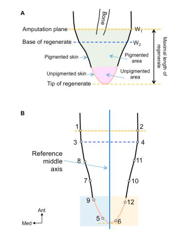 Supplementary Fig. S2. Assessment of the regenerated soft tissue, Related to STAR Methods and Figure 2. A. Diagram of a prototypical 2-mpa regenerate showing the biological meaningful elements and morphometric parameters used to evaluate the limb outcome over time: percentage of width change (W2 respect to W1; WID), percentage of unpigmented area (respect to the total regenerated area; UNA), and maximal length of the regenerate (LEN). WID: Before amputation, the limb has a constant width. This situation is not maintained after amputation and tissues start to narrow while outgrowth is progressing. A lower percentage of width change is, hence, an indicative of regenerative ability, as regenerate is closer to the original morphology, previous amputation. We evaluate the decrease in width experienced by the limb as consequence of the amputation by means of the percentage of change between two width values, before (W1, width at amputation plane, orange-dashed line) and after (W2, width at the base of the regenerate, bluedashed line) amputation, with the formula WID = (W2-W1)*100/W1. UNA: This variable quantifies the differences in pigmentation pattern of the regenerate, by means of the percentage of total regenerated area that is covered by unpigmented epidermis. To this, firstly, we calculated the total area regenerated (from the amputation plane to the tip of regenerate; green and pink surfaces in diagram, respectively). Secondly, a straight line indicating the demarcation of the totally unpigmented portion from the rest of the limb was drawn. Then, the area of the regenerate under that line (unpigmented area) was divided by the total area, with the formula UNA = pigmented area/ (pigmented+ unpigmented area)*100. LEN: We evaluate the maximal length of the regenerate by calculating the distance from the amputation plane to the plane set by the tip of the regenerate (distance between the two orange-dashed lines). To avoid size noise, this value was normalized to the total animal length (or distance from snout to vent, TOT LEN). This morphometric analysis 4 was performed on regenerates belonging each experimental group (Control and Prog-device, respectively) at five selected times for a 9.5-month period: 0.5, 1, 2.5, 5, 7.5 and 9.5 months post amputation (mpa). Representative images and graphs are indicated in Fig. 2A, B. B. Diagram of a prototypical 7.5-mpa regenerate including the positions of the twelve landmarks used for the geometric morphometrics analysis. To describe and quantify the changes in shape of the regenerate between Control and Prog-device groups, we employed MorphoJ software (Klingenberg, 2011), as extensively detailed in (Mondia et al., 2011). MorphoJ performs a geometric morphometric analysis based on landmarks or points used to define the profile of a shape. For our analysis, twelve landmarks defined each regenerate profile: the first six landmarks were biologically meaningful positions: 1 and 2 define the amputation plane, 3 and 4 for the base of the regenerate, 5 and 6 define the points at the tip of the regenerate. The other six points were semi-landmarks, chosen by successively finding the midpoints between the previous positions, as indicated by the numbers in the diagram. Landmarks were placed on digital images using ImageJ. MorphoJ is freely available from http://www.flywings.org.uk/MorphoJ_page.htm. A reference axis, passing through the middle point of a straight line linking landmarks 1 and 2, was placed on each profile. This axis was used to evaluate the curvature at the tip of the regenerate. This parameter was included as criterion for the regeneration Index. Curvature was considered positive when the four most distal landmarks (9, 12, 5 and 6) were situated on the same lateral plane (right or left) respect to the middle axis. In this example diagram, 9 and 5 are on left plane (blue square), as 12 and 6 are on the right one (orange square). The tip morphology of the illustrative diagram would be considered negative for the variable curvature. |