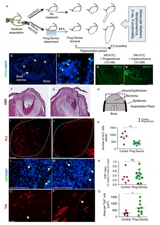Figure 1. 24-Hr Combined Progesterone-Device Treatment Changes Early Cellular Response, Decreasing the Early Leukocyte Invasion and Leading to a Scar-free Wound Healing with Higher Nerve Supply at Later Stages (A) Schematic showing the experimental design and integrative methodology for assessment of the regenerative potential. The orange dashed line indicates amputation plane. The black dashed lines delineate gross morphological outcomes for the two experimental groups. (BE) Expression of progesterone receptor (PR) on frog limbs revealed by fluorescent ligand binding assays and hormone displacement studies. (B) Low-magnification image of a cross-section of intact frog hindlimb after incubation with the fluorescent ligand for PR (progesterone 3-(O-carboxymethyl) oxime:BSA-fluorescein isothiocyanate conjugate [PFITC]) and counterstained with DAPI. In the center of the bone is the marrow containing PR+ mesenchymal cells (white arrowheads). (C) High-magnification image through the bone marrow of an intact frog hindlimb showing nuclear colocation for PFITC and DAPI labeling (white arrowheads). (D) Parallel section to (B) after PFITC co-incubation with a saturating concentration of the physiological agonist progesterone. No positive cells were detected. (E) Cross-section of frog hindlimb after PFITC co-incubation with an unspecific hormone, hydrocortisone. Since no competitive binding occurs, the fluorescent ligand reaction showed a similar positive pattern to the single PFITC incubation, as detected when compared to (B). Scale bar, 100 mm. (FH) H&E staining at 0.5 months post-amputation (mpa), showing the overall organization of the soft tissue after no subsequent treatment (Ctrl group, F) and after treatment with the silk-hydrogel device loaded with progesterone (Prog-device group, G). Two weeks after amputation, differences in the fibroblastema region (asterisk) were present between the two groupsmostly collagen accumulation in untreated animalsand frequent areas of irregular cells (asterisk) in Prog-device treated animals. In (H), a scheme with the main histological elements, as seen on sections along the longitudinal axis, is presented. (IK) Immune infiltration (after XL2 immunofluorescence) in the early fibroblastema of Ctrl (I) and Prog-device (J) animals. The number of leukocytes was significantly lower (K) in the apical region (or distal from the amputation plane, blue dashed line) of the blastema in the treated animals. (LN) The number of H3P-expressing proliferative cells (white arrows) normalized to the total number of cells (DAPI labeled, blue) between Ctrl (L) and Prog-device (M) animals at late-blastema stage (3 mpa) showed no significant differences (N). (OQ) The nerve patterning, as detected after tubulin (Tub) immunofluorescence on longitudinal sections, was less organized in Ctrl (O) group than after Progdevice treatment (P). The former was characterized by the presence of specialized groups or bundles of nerve fibers, with higher area per positive unit (Q). (I, J, L, M, O, and P) Scale bars, 100 mm. (I and J) Amputation plane is right, medial is up. (L and M) Amputation plane is up, medial is left. (O and P) Amputation plane is left, lateral is up. (FQ) Micrographs show longitudinal sections (see Figure S5A for scheme). (K, N, and Q) Values are represented with scatterplots, in which each dot represents one histological section and each dot style represents one animal (with at least three histological sections). Statistical analysis was performed on the pooled individual sections. Horizontal line indicates mean. p values after t test (equal variances; N) or Mann-Whitney test (unequal variances; K and Q) are indicated as *p < 0.05, **p < 0.01, ns, p > 0.05. |
