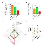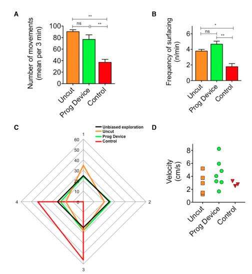 Figure 5. Locomotor Activity in Prog-Device Treated Animals Resembles More Closely that of Uncut Animals (A) Quantifications of efficient activity levels, measured by counting the number of active movements (with trajectory displacement). Values are represented as mean ± SD (n = 4 animals per group). One-way ANOVA p < 0.01. p values after Bonferroni’s post hoc analysis are indicated as *p < 0.05, **p < 0.01, ns, p > 0.05. (B) Surfacing frequency or number of visits to the water-air surface performed by each experimental group per time unit (minute). Values are represented as mean ± SD (n = 4 animals per group). One-way ANOVA p < 0.01. p values after Bonferroni’s post hoc analysis are indicated as *p < 0.05, **p < 0.01, ns, p > 0.05. (C) Graphic representation of the percentage of time spent in each quadrant of the tank per experimental group. Unbiased exploration (black line) is shown as reference (25% of time in each quadrant). Analysis of the time distributions within each experimental group showed clear significant differences (p < 0.01 for c2 (0.05,9)). Data represent the pooled distribution of animals per group (see Figure S6A for contingency graph). (D) Mean speed (expressed in centimeters per second) at which each animal (represented by individual dots) swims around the tank. Orange squares, uncut or intact animals; green circles, amputated animals followed by Prog-device combined treatment; red triangles, amputated animals without additional treatment. |