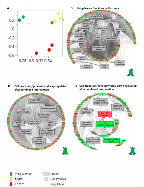 Figure 7. Potential Targets (Gene Networks and Cell Processes) of the Combined Treatment (Device + Drug) (A) Unweighted principal coordinate analysis (PCoA) demonstrated a clear separation of red, yellow, and green clusters representing Ctrl (or ‘‘no device’’), Sham (or ‘‘only device’’) and Prog-device (or ‘‘device + drug’’), respectively |