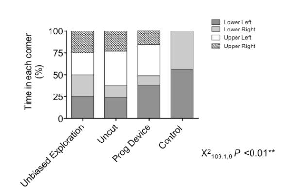 Supplementary Fig. S6. Behavioral observations of exploration and positional information, Related to Figure 5. Contingency analysis for the mean percentage of time spent in each quadrant per experimental group. P <0.01 for X2 (0.05, 9)=109.1. |