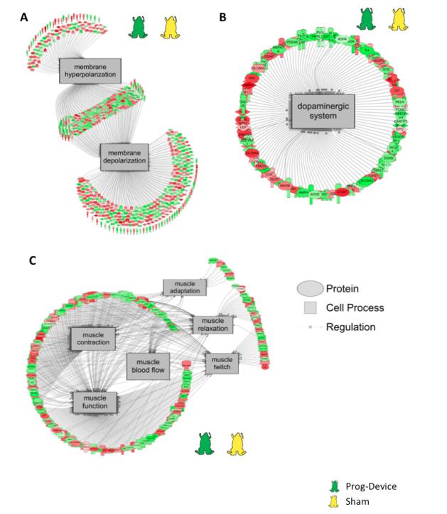 Supplementary Fig. S7. Common down-regulated cell processes and gene networks for both Sham and Prog-device treatments. Related to Figures 6 & 7. Subnetwork enrichment analysis of blastema exposed to only hydrogel device (Sham group) or combined hydrogel plus drug (Prog-Device group) identified common down-regulated pathways involved in (A) changes in membrane potential, (B) dopaminergic system and (C) muscle physiology. Complete data are presented in Appendix 1. All genes within a pathway are located in Appendix 2. Green = down gene, Red = up gene. |