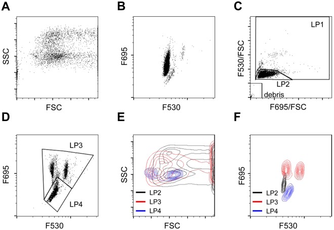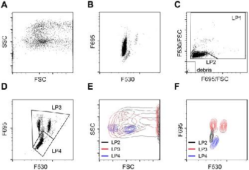 Figure 2. Scattergram analysis of peripheral blood from X. laevis. (A) Scattergram indicates forward-scattered light (FSC) and side-scattered light (SSC). (B) Scattergram indicates the F530 and F695 fluorescence intensity. (C) X. laevis blood cell population LP1, LP2, and debris fractions developed based on the cellular red fluorescence intensity (F695/FSC) and cellular red fluorescence intensity (F530/FSC). (D) LP3 and LP4 were determined based on the F695 fluorescence intensity. (E) LP2, LP3, and LP4 were identified based on FSC and SSC. LP2 and LP3 partially overlapped, and LP4 completely overlapped with LP2 and LP3. (F) LP2, LP3 and LP4 were determined based on the F530 and F695 fluorescence intensity. LP2: Erythrocytes (grey); LP3: Granulocytes (Red); LP4: Lymphocytes and Thrombocytes (Blue). |