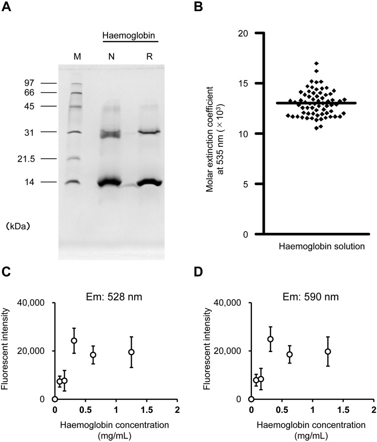 Figure 1. The molar extinction coefficient of sodium lauryl sulphate-haemoglobin (SLS-Hb). (A) X. laevis haemoglobin was purified, and SDS-PAGE was performed. Monomeric (14 kDa) and dimeric (30 kDa) Hbs were detected. M: Molecular marker; N: Non-reduction condition; R: Reduction condition. (B) The absorbance at 535 nm of SLS-Hb was measured and the molar extinction coefficient was calculated. Bar indicates the mean of the extinction coefficient (n = 66). (C,D) The fluorescence of purified haemoglobin was measured. (C) Excitation 485/20 nm, emission 528/20 nm. (D) Excitation 485/20 nm, emission 590/35 nm. |
