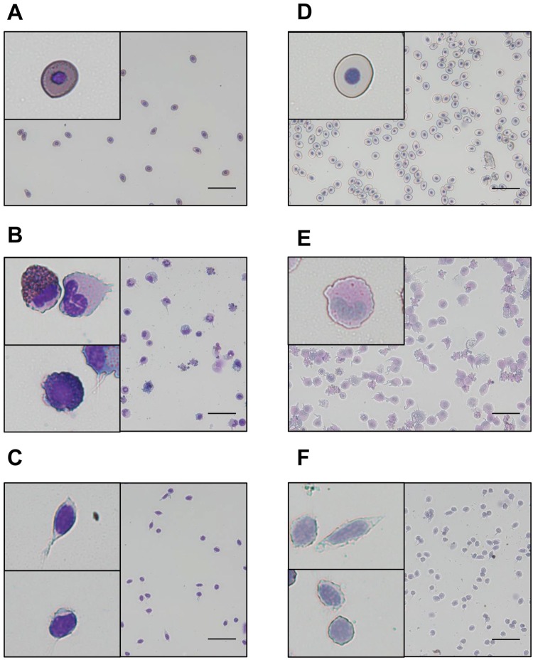 Figure 3. Morphology of LP2, LP3, and LP4 cells. Erythrocytes and leukocytes/thrombocytes separated from whole blood cells using the Percoll method were analysed and sorted. May-Grunwald Giemsa (MGG) and periodic acid-Schiff (PAS) staining were performed on the LP2, LP3, and LP4 fractions. (AâC) MGG staining. (A) LP2, (B) LP3, and (C) LP4. LP2 cells were mononuclear with a large cytoplasm. LP2 cells had eosinophilic cytoplasm. LP3 had segmented nuclei and a large cytoplasm. Cells with a basophilic cytoplasm were found in the LP3 fraction. LP4 cells were mononuclear with a small cytoplasm. (DâF) PAS staining. (D) LP2, (E) LP3, and (F) LP4. The LP2 and LP4 cells were negative for PAS staining, and LP3 cells were positive for PAS staining. Scale bars: 20âµm. LP2: erythrocyte; LP3: granulocyte; LP4: lymphocyte and thrombocyte (inset). |