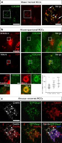 Fig. 3. CDC20B associates to vertebrate deuterosomes. a Double immunofluorescence was performed on mouse tracheal MCCs after 3 days of culture in airâliquid interface. Low magnification confocal panels show coincident CDC20B and DEUP1 staining in several individual MCCs. High magnification on a single MCC reveals the prominent association of CDC20B to large deuterosomes marked by DEUP1 (arrowheads). Note that some smaller deuterosomes do not contain CDC20B (arrows). b Mouse ependymal MCCs were immunostained as indicated, and high magnification confocal pictures of cells with immature and mature deuterosomal figures were taken. In these cells, centrioles revealed by FOP form a ring around deuterosomes. CDC20B staining forms a ring inside the ring of FOP-positive procentrioles indicating that CDC20B is tightly associated to deuterosomes. Note that the CDC20B signal associated to deuterosome increased with their maturation (high magnification pictures of >25 cells per category from two different animals were quantified in the graph; mean values and standard deviations are shown). Unpaired t test vs immature: pâ=â0.0005 (intermediate, ***); pâ<â0.0001 (mature, ****). In a and b, zooms were made on regions identified by dashed boxes. c Xenopus embryos were injected with GFP-Deup1 mRNA and immunostained at neurula st18 as indicated. Scale bars: 5âµm (a, b, large view), 1.5âµm (a, high magnification), 500ânm (b, high magnification), 10âµm (c) |