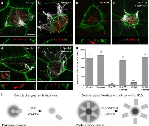 Fig. 7. Separase overexpression rescues multiciliogenesis in absence of Cdc20b. aâf 8-cell Xenopus embryos were injected in the presumptive epidermis with GFP-gpi mRNA, cdc20b morpholinos, and human Separase mRNA, as indicated. Embryos were fixed at tailbud st25 and immunostained against GFP (injection tracer, green), Acetylated-α-Tubulin (cilia, white) and É£-Tubulin (BBs, red). White dotted lines indicate the position of orthogonal projections shown in bottom panels. Red arrowheads point undocked BBs. Left inset in e shows zoom on clustered centrioles. g Bar graph showing the mean number of properly ciliated MCCs among injected cells, per field of observation, with standard error mean, from two independent experiments. Counting was performed on pictures taken at low magnification (Ã20), in order to score a large number of cells. Separase overexpression fully rescued multiciliogenesis in cdc20b morphant MCCs. One-way ANOVA and Bonferroniâs multiple comparisons on two experiments, ***pâ<â0.0001, nspâ>â0.05. Scale bars: 5âµm (a). h Model illustrating the analogy between centriole disengagement in mitotic cells and centriole release from deuterosomes in post-mitotic MCCs |