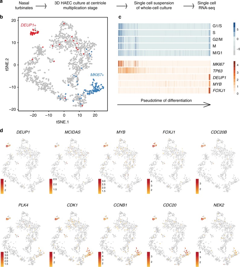 Fig. 1. Single-cell RNA-seq analysis reveals MCC transcriptome at deuterosome stage. a Experimental design of the scRNA-seq experiment. b tSNE plot. Each point is a projection of a unique cell on a 2D space generated by the tSNE algorithm. Blue dots represent MKI67-positive proliferating cells, and red dots represent DEUP1-positive cells corresponding to maturing MCCs at deuterosome stage. c Cell cycle-related gene set expression in HAECs measured by scRNA-seq. Cells were ordered along a pseudotime axis, defined with the Monocle2 package. Phase-specific scores are displayed in the top heatmap. Expression of selected genes is displayed in the bottom heatmap. d tSNEs plots for a selection of genes specifically enriched in deuterosome stage cells. Note that CDC20B exhibits the most specific expression among deuterosome marker genes |