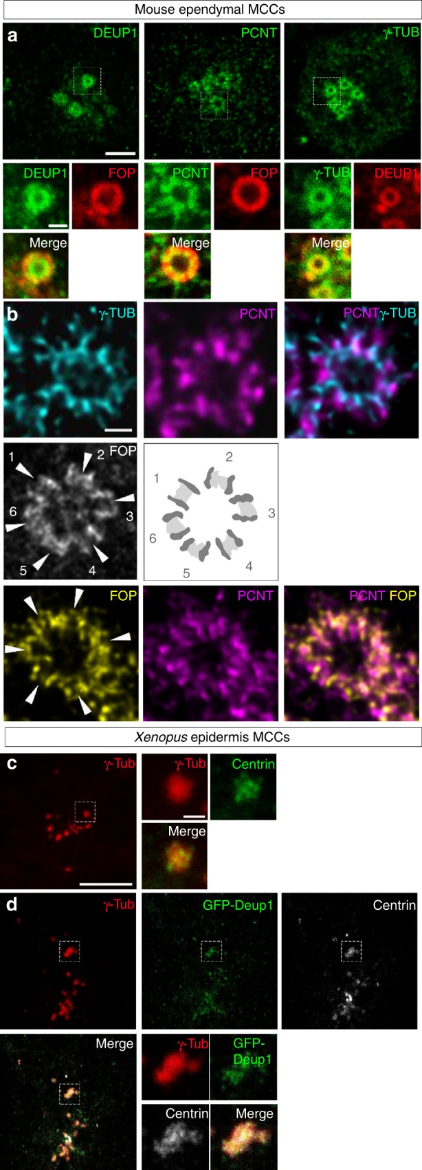 Fig. 2. Composition and organization of vertebrate deuterosomes a, b Maturing mouse ependymal MCCs were immunostained as indicated, pictures were taken with confocal (a) or STED (b) microscope. a Individual deuterosomes (dashed boxes in top panels) are shown at higher magnification in bottom panels. DEUP1 stains the deuterosome core (ring) and a close fibrous area that defines the perideuterosomal region. The centriolar marker FOP reveals procentrioles arranged in a circle around the deuterosome. Pericentrin (PCNT) is enriched in the perideuterosomal region. γ-Tubulin (γ-TUB) stains the core as well as the periphery of the deuterosome. b STED pictures showing the organization of FOP, PCNT, and γ-TUB around deuterosomes. Individual centrioles identified by FOP staining are pointed out with arrowheads. The diagram was drawn from the adjacent FOP photograph to help reveal the regular concentric organization of nascent centrioles in a typical deuterosomal figure. c Xenopus embryos were immunostained for γ-Tubulin (γ-Tub) and Centrin and high magnification pictures of immature epidermal MCCs were taken. In these cells, Centrin-positive procentrioles grow around γ-Tubulin-positive structures. d Xenopus embryos were injected with Multicilin-hGR and GFP-Deup1 mRNAs, treated with dexamethasone at gastrula st11 to induce Multicilin activity, and immunostained at neurula st18 for γ-Tubulin, GFP, and Centrin. In c and d, zooms (right panels) were made on regions identified by dashed boxes. Scale bars: 5âµm (a, top), 500ânm (a, bottom), 500ânm (b), 10âµm (c, d, large view), 1âµm (c, d, high magnification) |