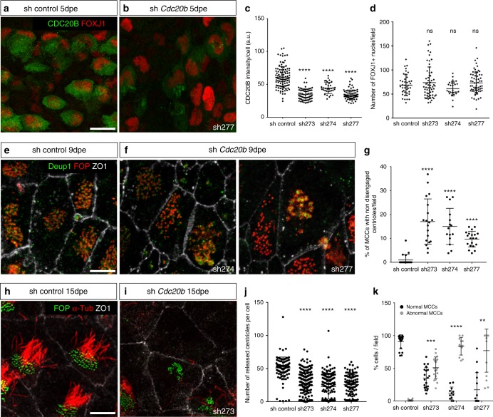 Fig. 4. CDC20B knockdown impairs multiciliogenesis in mouse ependymal MCCs. a, b Ependyma were stained for CDC20B (green) and FOXJ1 (nuclear MCC fate marker, red) 5 days post electroporation (5dpe) of control shRNA (a) or Cdc20b shRNA (b). sh277 is exemplified here, but all three Cdc20b shRNAs produced similar effects. c Graph showing the quantification of CDC20B protein levels in cells at the deuterosomal stage at 5dpe from two experiments. Mean values and standard error are shown. Unpaired t-test: ****pâ<â0.0001. d Dot plot showing the number of FOXJ1-positive nuclei observed for each field, with mean values and standard deviations from two experiments. Unpaired t-test: pâ=â0.3961 (sh273, ns), pâ=â0.1265 (sh274, ns), pâ=â0.3250 (sh277, ns). No significant variations were observed between conditions, indicating that MCC fate acquisition was not affected by Cdc20b knockdown. e, f Confocal pictures of 9dpe ependyma electroporated with control shRNA (e) or Cdc20b shRNAs (f) and stained for DEUP1 (deuterosome, green), FOP (centrioles, red) and ZO1 (cell junction, white). DEUP1-positive deuterosomes with non-disengaged FOP-positive centrioles were observed much more frequently in MCCs electroporated with Cdc20b shRNAs compared to control. g Dot plot showing the percentage of MCCs with non-disengaged centrioles per field, with mean values and standard deviations. Two experiments were analyzed. Unpaired t-test: ****pâ<â0.0001. h, i Confocal pictures of 15dpe ependyma stained for FOP (centrioles, green), α-Tubulin (α-TUB, cilia, red), and ZO1 (cell junction, white) showing the morphology of normal MCCs in shRNA control condition (h), and examples of defects observed in MCCs treated with sh Cdc20b (i). j Dot plot showing the number of released centrioles per cell, with mean values and standard deviations. k Dot plot showing the percentage of normal and abnormal MCCs per field of observation, with mean values and standard deviations. MCCs were scored abnormal when they did not display organized centriole patches associated to cilia. Three experiments were analyzed. Unpaired t-test: pâ=â0.0004 (sh273, ***), pâ=â0.0001 (sh274, ****), pâ=â0.0038 (sh277, **). Scale bars: 20âμm (a), 5μm (e, i) |