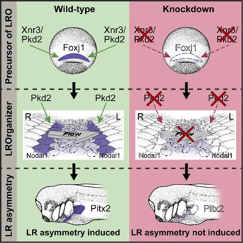 Nodal signaling controls asymmetric organ placement during vertebrate embryogenesis. Nodal is induced by a leftward fluid flow at the ciliated left-right organizer (LRO). The mechanism of flow sensing, however, has remained elusive. pkd2 encodes the calcium channel Polycystin-2, which is required for kidney development and laterality, and may act in flow perception. Here, we have studied the role of Polycystin-2 in Xenopus and show that pkd2 is indispensable for left-right (LR) asymmetry. Knockdown of pkd2 prevented left-asymmetric nodal cascade induction in the lateral plate mesoderm. Defects were due to failure of LRO specification, morphogenesis, and, consequently, absence of leftward flow. Polycystin-2 synergizes with the unconventional nodal-type signaling molecule Xnr3 to induce the LRO precursor tissue before gastrulation, upstream of symmetry breakage. Our data uncover an unknown function of pkd2 in LR axis formation, which we propose represents an ancient role of Polycystin-2 during LRO induction in lower vertebrates.