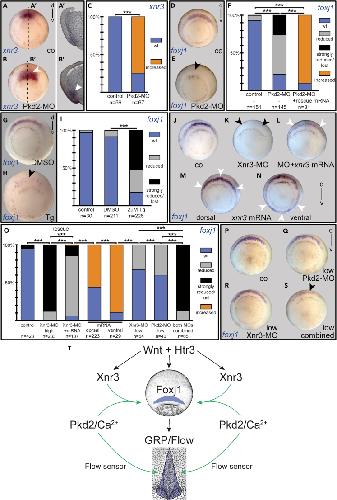 Figure 4. Polycystin-2 and Xnr3 Synergize to Induce the LRO Precursor Tissue of the Superficial Mesoderm(AâF) Increased xnr3 (AâC) and reduced foxj1 expression (DâF) in stage 10.5 pkd2 morphants (B and E) as compared with control specimens (A and D). Dotted lines in A and B indicate plane of histological sections shown in Aâ², and Bâ², respectively. Note that foxj1 expression was rescued upon co-injection of a full-length pkd2 mRNA (F).(GâI) Reduced foxj1 expression in early gastrula stages (st. 10.5) following Tg treatment (G, DMSO control embryo; H, Tg treated specimen; I, quantification of results).(JâS) xnr3 and pkd2 synergize SM foxj1 induction. Loss of xnr3 resulted in attenuated foxj1 expression (K and O) compared with control uninjected specimens (J and O), which was highly efficiently rescued by co-injection of full-length xnr3 mRNA (L and O). Both dorsal (M) and ventral (N) overexpression of xnr3 mRNA caused an increase of endogenous or induction of ectopic foxj1, respectively (MâO). Injections of reduced MO doses of Xnr3-MO (O, R; 2 à 0.6pmol) or Pkd2-MO (O, Q; 2 à 0.75pmol) caused mild reductions of foxj1 expression. Co-injection of low doses of MOs resulted in strong inhibitory effects (O and S).(T) Schematic depiction of known (black) and proposed (green) interactions required for SM specification. For details refer to main text. Increase of expression highlighted with white arrowheads and decrease with black arrowheads. Numbers in parentheses indicate the number of embryos analyzed for each condition.See also Figures S4 and S5. |