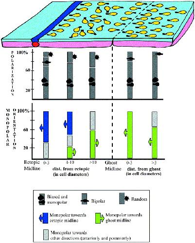 Fig. 5. Polarization and orientation of cells in midlineless-explants-with-ectopic-midline. The schematic at the top summarizes the state of polarization of cells in this style of explant. All cells become monopolar and oriented to whichever midline is closest to them, except for cells that are equidistant from the ghost and the ectopic midline, which instead point toward more random directions. Below the schematic of the explant, the two graphs categorize cells by distance from the ectopic or the ghost midline along the x-axis (0–3, 4–10, and over 10 cells away from the ectopic midline; 0–3 and over 3 cells away from the ghost midline). The top graph shows the percentage of cells in particular polarization states (monopolar and biased combined, bipolar, and random), and the bottom graph shows the percentage of monopolar cells that point in particular orientation. |