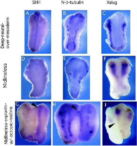 Fig. 6. Patterning of deep-neural-over-mesoderm explants, midlineless explants and midlineless-explants-with-ectopic-midline. Deep-neural-over-mesoderm explants maintain a very close to normal mediolateral pattern of gene expression as seen through Sonic Hedgehog, N-β-tubulin, and Xslug (AâC). Midlineless explants have no remaining midline, as shown by the absence of SHH expression (D). They express N-β-tubulin, but the pattern of expression of that gene is often disturbed (E), while Xslug is strongly expressed, though variable in breadth (F). Midlineless-explants-with-ectopic-midline have no SHH stripe in the midlineless portion, but it is present in the portion of the ectopic midline as expected (G). In addition, they express N-β-tubulin and Xslug in both the midline-free and the midline-containing parts of the explants (H, I). Pointers indicate the ectopic midline; all explants were fixed for in situ when whole embryos used as control reached stage 21 to 23. |