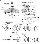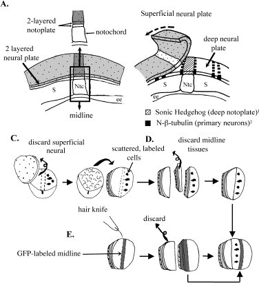 Fig. 1. Explantation technique depicting how explants discussed in this paper are made. (A) This schematic shows the tissues relevant to our explants, including the notoplate, the neural plate (NP), the notochord (Ntc), the somitic mesoderm (S), endodermal epithelium (ee), and the midline (notoplate, notochord and underlying endodermal epithelium). (B) This schematic shows the expression of genes relevant to this paper, including Sonic Hedgehog in the deep notoplate, and N-β-tubulin in the deep neural plate. (C) Deep-neural-over-mesoderm explants: We first remove and discard the superficial neural tissue (dotted) at stage 13. We then explant the dorsal 180 degree sector of the embryo and culture it under coverslip. The dashed lines represent the edges of the notochord, slightly visible under the deep neural tissue. (D) Midlineless explants start as deep-neural-over-mesoderm explants, from which we subsequently remove the notochord, notoplate and underlying endoderm. We then push together the two lateral sections of deep neural tissue over somitic mesoderm and allow healing to occur. (E) Midlineless-explants-with-ectopic-midline require at least two embryos. The first embryo was previously injected with red dextran at stage 6 1/2 to produce a scatter of red labeled cells (red scattered cells). The second embryo was either injected with fluorescein dextran at the one-cell stage and was therefore entirely green fluorescent or was a transgenic Otx2:GFP embryo with a green fluorescent notochord (as depicted in this figure). NP, Neural plate; S, Somitic mesoderm; Ntc, Notochord; ee, Endodermal epithelium; sup, superficial; mdln tiss, midline tissues; h.k., hair knife. Davidson and Keller, 19991; Lance Davidson, unpublished observations.2 |
