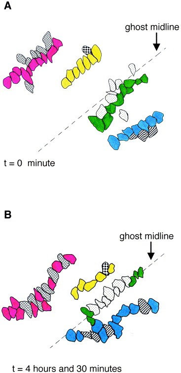 Fig. 3. Conservative intercalation occurs in midlineless explants. Colored cells show columns of cells that were traced to the end of the movie to see which cells intervened between them. Patterned cells are the cells that intervened between the colored cells. (A) Unbroken columns of cells at the beginning of a timelapse series. (B) By the end of the time lapse, patterned cells have intercalated between the colored cells; however, they were very close neighbors of the colored cells at t = 0. |