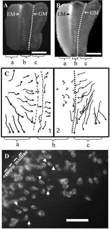 Fig. 4. Motility in midlineless-explants-with ectopic-midline. (A, B) A midlineless-explant-with-ectopic-midline made from an Otx2:GFP transgenic embryo converges and extends between t = 0 (A) and t = 4.5 h (B). The notochord lights up with GFP driven by the Otx2 promoter, demarcating the ectopic midline; the ghost midline is shown as a dotted white line. Labeled cells (white sprinkle) sandwiched between the ectopic midline and the ghost midline (section âbâ) were followed for translocation (direction of their overall displacement) and protrusive activity. Scale bar in (A) and (B), 0.5 mm. (C) In midlineless-explants-with-ectopic-midline, cells in the neural plate of the donor midline (section âaâ) converge to that midline. The two parallel dashed lines represent the edges of the notochord seen through the deep neural plate. Cells in the midlineless component of the explant (section âbâ) still converge and extend, although their movement is erratic. Cells in section âcâ get displaced toward their endogenous (ghost) midline through intercalation. The two parallel dashed lines represent the ectopic midline, and the dotted line is the ghost midline, at the beginning of the time-lapse sequence. The two panels, (1) and (2), come from two different embryos. (D) Frame from a movie shows protrusive cells in the section âbâ of an explant with an ectopic midline. Arrows point to protrusions. Scale bar; 0.1 mm. |
