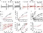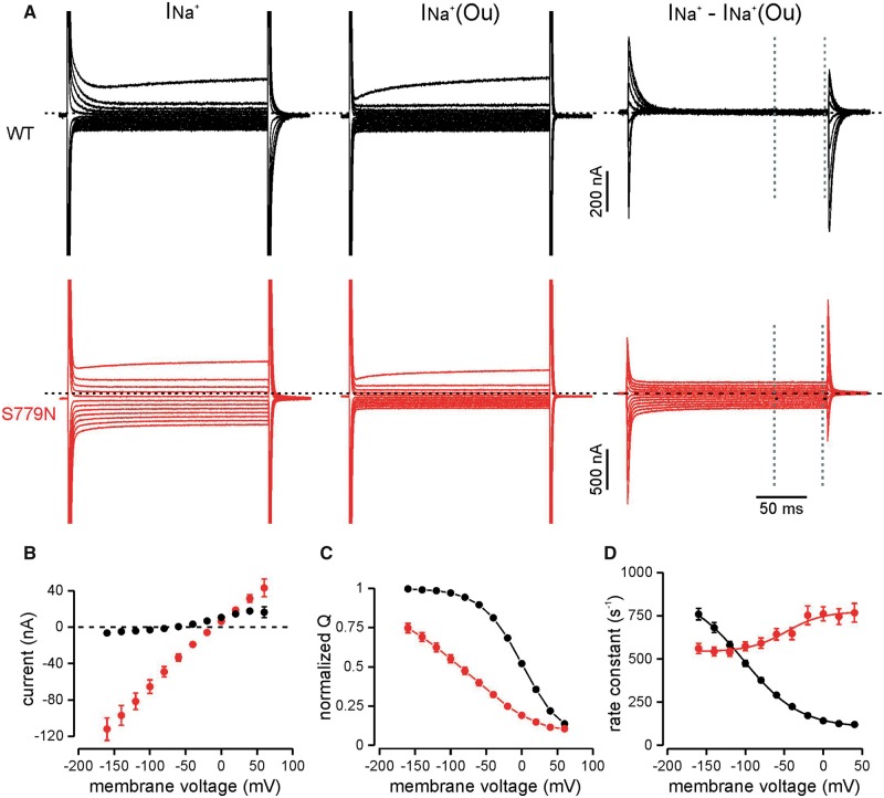 Steady state and transient Na+ currents of WT and p.S779N pumps in the absence of extracellular K+. (A) Representative raw current traces in absence (left) and presence (middle) of 10 mM ouabain and the ouabain-sensitive currents (right) in wild-type (black) and p.S779N (red) pumps in response to voltage steps from −160 to +60 mV, in 20-mV increments. Steady state currents at each voltage were measured in the last 50 ms of the 200 ms stimulus, indicated by dotted lines. (B) Average ouabain-sensitive steady state leak currents. Slope conductance between −140 mV and 0 mV was 0.75 ± 0.08 nA/mV for the p.S779N pump (n = 27) while it was close to 0 for the wild-type pump (n = 29). (C) Charge-voltage relationships. Na+ charge transfer was determined from the integral of the first 50 ms of the current trace at −30 mV following the steps to test voltages. Individual QV curves were fit by a standard Boltzmann function and normalized to their respective fits. V1/2: p.S779N −95.4 ± 7.1 mV, n = 25; wild-type 2.6 ± 1.7 mV, n = 29; slope: p.S779N 66.8 ± 4.8 mV, wild-type 28.9 ± 0.7 mV, P < 10−5, unpaired t-test. (D) Rate constants of transient currents at the onset of the stimulus. Solid line represents a Boltzmann fit and yielded the overall forward/backward rate constants (p.S779N, 773.9 ± 27.7/542.6 ± 12.7 s−1, n = 22 wild-type 102.3 ± 3.6/882.2 ± 32.9 s−1, n = 26; P < 0.0001, unpaired t-test).