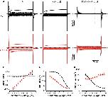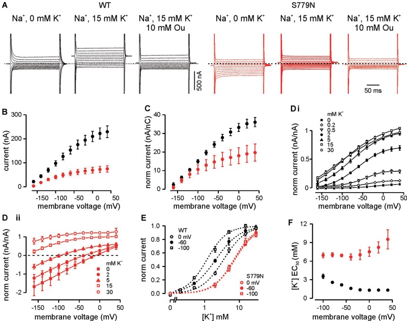 Forward pumping currents of WT and p.S779N α 2 at various extracellular [K+]o. (A) Example current traces of wild-type (black) and mutant (red) pumps in response to 200 ms steps from −160 to +40 mV, from a holding voltage of −30 mV in absence (left) and presence (middle) of 15 mM K+, and in presence of 15 mM K+ and 10 mM ouabain (right). K+-induced pump currents were isolated off-line by subtraction of currents in the presence of ouabain 10 mM. (B) Current-voltage relationship of steady state ouabain-sensitive currents measured in last 50 ms of each step (p.S779N n = 17; wild-type n = 20; P < 0.0001 two-way ANOVA). (C) Current-voltage relationship of ouabain-sensitive currents normalized to total Na+ charge transfer (Qtot) in absence of K+, as a measure of functional protein expression (p.S779N n = 7; wild-type n = 13; P = 0.001, two-way ANOVA). Qtot was estimated in a subset of cells where lower amplifier gain was used to minimize current saturation because of capacitive artefacts. Ten traces were averaged to reduce the noise and then used to determine the span of the Boltzman curve (Qtot: S779N 5.4 ± 0.9 nC, n = 7; wild-type 5.5 ± 0.7 nC, n = 13). (D) Extracellular apparent K+ affinity of the ATPases: current-voltage relationships of wild-type (i) and mutant pumps (ii) in various [K+]o conditions normalized to the outward current at +20 mV in 15 mM K+ (p.S779N n = 5–6; wild-type n = 3–5). (E) Concentration-response curves obtained from the data in D at three representative voltages. Dotted lines represent fits to a modified Hill equation (wild-type EC50 at −100, −60, 0 mV: 3.5 ± 0.3, 2.2 ± 0.2, 1.3 ± 0.1 mM, n = 5; P < 0.0001 repeated measures ANOVA; p.S779N EC50 at −100, −60, 0 mV: 6.9 ± 0.4, 6.9 ± 0.2, 7.5 ± 0.7 mM, n = 5; P = 0.7). Curves obtained from separate experiments were normalized to the top and bottom values of the fit and averaged across oocytes. Hill coefficients were voltage independent and did not change significantly between pump variants: wild-type 1.54 ± 0.06, S779N 1.56 ± 0.06 (P = 0.3, two-way ANOVA across the voltages). (F) Overall voltage dependence of apparent [K+] affinity (wild-type n = 3–5; p.S779N n = –5, P < 0.001 two-way ANOVA).