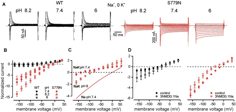 Ionic contributions to the p.S779N ATPase leak current. (A) Representative current traces in 0 [K+]o for wild-type (black) and p.S779N (red) illustrating changes in leak currents with varying [H+]o. (B) Steady state current-voltage relationships in different pH conditions normalized to current at +20 mV in pH 7.4 (n = 4 for both). Linear fits to raw leak currents (not shown) in p.S779N indicate an increase in slope conductance with acidification from 0.54 ± 0.1 to 0.85 ± 0.2 nA/mV (P = 0.03, paired t-test) and a shift in Erev from −12.7 ± 2.5 to −2.2 ± 2.6 mV (P = 0.01). For pH 8.2 the slope was 0.43 ± 0.1 (P = 0.15) and Erev = −17.8 ± 2.2 mV (P = 0.06). (C) Increase in inward leak currents in p.S779N pump with acidification in the presence of 15 mM [K+]o; comparison with linear leak in Na+-only (pH 7.4) conditions (n = 4). Currents have been normalized to amplitude at +20 in pH 7.4. (D) Average steady state currents for wild-type (left) or p. S779N (right) pumps in control conditions (115 mM Na+, 0 K+) and when 86 mM Na+ is substituted with NMDG+. Currents have been normalized to control value at +20 mV (wild-type n = 6, P = 0.008; p.S779N n = 7, P = 0.001 repeated measures ANOVA). For the mutant pump, Erev shifted from −16.2 ± 1.5 mV in Na+ to −48.8 ± 10 mV in Na/NMDG+ (n = 7, P = 0.016, Wilcoxon paired t-test).