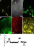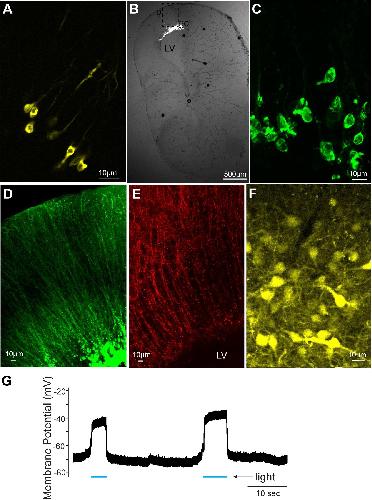 FIGURE 2. Cells labeled with fluorescent proteins after electroporation and Adeno-associated virus (AAV) injection. (A) Yellow fluorescent protein (YFP)-labeled tadpole neurons 1 day after plasmids were electroporated in vivo. (B) Transverse section of lefttelencephalon of adult X. laevis 5 days after plasmids were electroporated in vivo. LV indicates lateralventricle. (C) Green fluorescent protein (GFP)-expressing cells (inset shown in C) that lack processes of neurons, presumed to be glial cells. (D) Labeled processes of glial-like cells (inset shown in C) that seem to form the ependymal lining of the ventricle. (E) Vimentin-positive radial glial cells in the adult telencephalon. (F) YFP-labeled telencephalic neurons of one of the very few brains that expressed reporter genes in response to AAV injection. (G) Membrane potential of a presumed glial cell electroporated with plasmid (pCS2FA.ChR2.YFP) positive for YFP and Channelrhodopsin 2 (ChR2). In response to blue light exposure (indicated in blue lines below the trace), the membrane potential depolarized, presumably because of the ChR2 expression, but the cell never spiked an action potential.