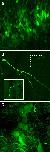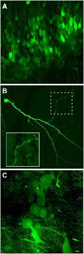 FIGURE 3. Neuroanatomical evidence that recombinant vesicular stomatitis virus encoding its own glycoprotein [rVSV(VSV-G)] transduce adult X. laevis neurons (i.e., transgene was moved from the virus to the neurons). (A) Adult X. laevis neurons in telencephalon expressing reporter gene (Venus 2) 48 h after injection of rVSV(VSV-G) plaque 21. Transduction efficiency was 86% (24/28 animals). (B) A lone infected neuron in optic tectum away from the injection site with a robust expression of reporter gene in dendrites, axons, dendritic spines and synaptic boutons observed 68 h after injection of rVSV(VSV-G) plaque 21. A dotted area is enlarged in the bottom left. (C) Neurons in laryngeal motor nucleus (n.IX-X) expressing Venus 2 48 h after injection of rVSV(VSV-G) plaque 21. The transduction efficiency in the brainstem with this strain of virus was 50% (9/18 animals). Scale bar is 10 μm, and applies for all three panels.