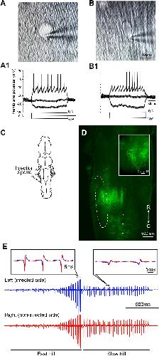 FIGURE 4. Neurons infected with vesicular stomatitis virus (VSV) are physiologically functional. (A) Differential interference contrast (DIC) image of an adult X. laevis telencephalic neuron expressing reporter gene (enhanced green fluorescent protein, eGFP) in a whole-cell patch-clamp configuration. The brain was injected with recombinant VSV encoding rabies glycoprotein [rVSV(RABV-G)] 2 days prior to the recordings was obtained. (A1) Membrane potential in response to current injections into the neuron shown in (A). (B) A DIC image of a non-labeled telencephalic neuron near the neuron shown in (A) on the same slice preparation. (B1) Membrane potential of neuron B in response to current injection. (C) Schematic diagram illustrating the unilateral injection of recombinant vesicular stomatitis virus encoding its own glycoprotein [rVSV(VSV-G)] into the laryngeal motor nucleus, n.IX-X. (D) Horizontal section of the brainstem showing the labeled neurons in the n.IX-X (encircled in dotted white line) 2 days after rVSV(VSV-G) was injected. Reporter gene expression was observed in the somata and axons (inset) of vocal motoneurons. White arrowheads indicate the midline. (E) A fictive advertisement call elicited from the isolated infected brain shown in (D) in response to the application of serotonin (5-HT). The advertisement call is made of fast and slow trills (labeled below the traces). Extracellular recordings obtained from the left (blue) and right (red) laryngeal nerves are shown. Inset shows enlarged sections of the left and right extracellular recording traces superimposed to demonstrate the temporal synchrony.