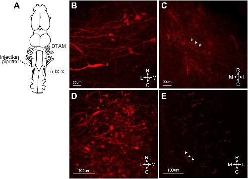 FIGURE 6. Retrograde infection of recombinant vesicular stomatitis virus (VSV) missing the glycoprotein (G) gene from its genome, but pseudotyped with the wild-type VSV-G [rVSVΔG(VSV-G)]. VSV infect the neurons via axon terminal. (A) A cartoon showing the dorsal view of the X. laevis brain with the unilateral injection of rVSVΔG(VSV-G) into the left anterior laryngeal motor nucleus (n.IX-X). (B) Nine days after injection, labeled somata with lateral axonal projections were found in ipsilateral dorsal tegmental area of medulla (DTAM). (C) In the contralateral DTAM, there were no labeled neuron somata but some labeled processes (white arrow heads). (D) Left n.IX-X injected with rVSVΔG(VSV-G) shows a large number of labeled neurons. (E) The contralateral n.IX-X show no labeled neurons, but labeled axons are seen (white arrow heads).