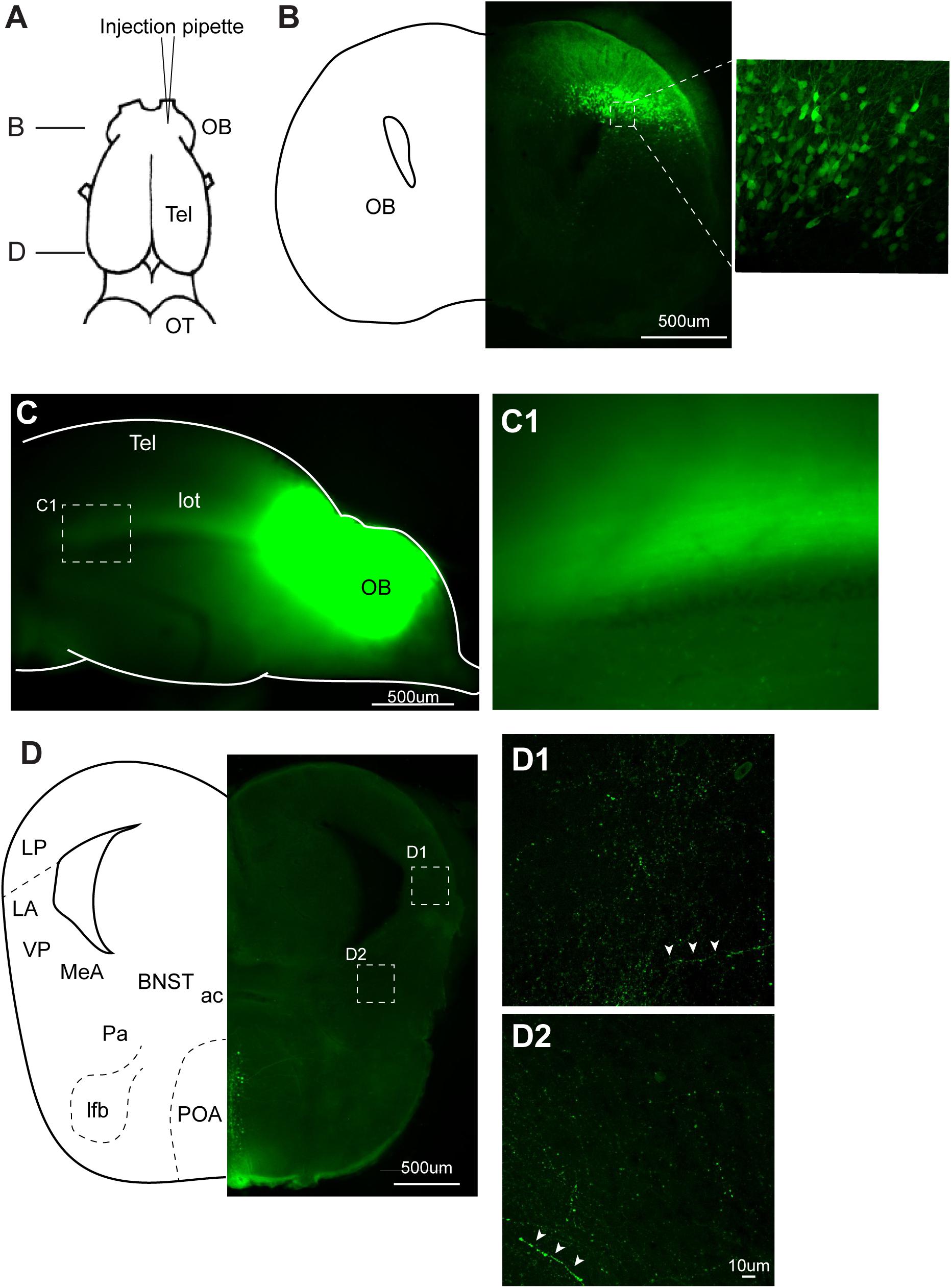FIGURE 7. Recombinant vesicular stomatitis virus encoding VSV glycoprotein [rVSV(VSV-G)] does not spread across axons in anterograde direction in the central nervous system of Xenopus laevis. (A) A dorsal view of the X. laevis forebrain illustrating the injection site of the virus into olfactory bulb (OB). Tel, telencephalon; OT, optic tectum. (B) A coronal section of the olfactory bulb at the rostral-caudal level shown in (A), showing a large number of labeled neurons in the injected side 10 days post injection. The inset shows an enlarged section showing labeled neurons. (C) A lateral view of the left olfactory bulb and left telencephalon in which VSV was injected 10 days prior. Lateral olfactory tract (lot) is visible from the surface of the telencephalon. (C1) An enlarged view of the lateral olfactory tract shown in (C). (D) A coronal section of the caudal telencephalon at the rostral-caudal level shown in A. No labeled neurons were found either in lateral amygdala (D1) or in medial amygdala (D2). White arrow heads show labeled processes. Labeled neurons seen in preoptic area (POA) are considered to have resulted from the intracranial leak of the injected virus from the injection site in the olfactory bulb. ac, anterior commissure; BST, bed nucleus of the stria terminalis; LA, lateral amygdala; lfb, lateral forebrain bundle; LP, lateral pallium; MeA, medial amygdala; Pa, pallidum; POA, preoptic area; VP, ventral pallidum.