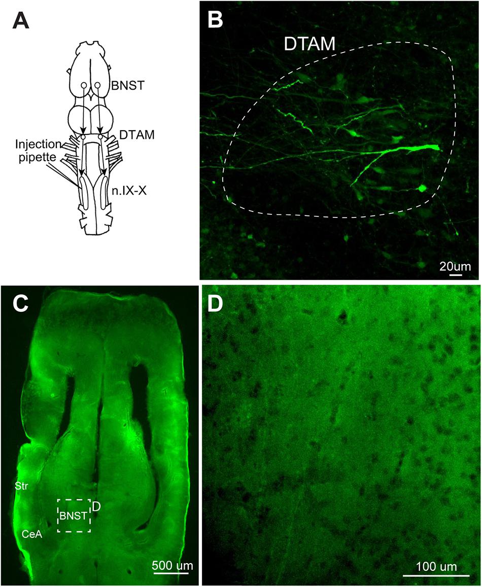 FIGURE 8. A test for the transsynaptic spread of recombinant vesicular stomatitis virus encoding rabies glycoprotein [rVSV(RABV-G)]. (A) A dorsal view of the X. laevis forebrain illustrating the connection among laryngeal motor nucleus (n.IX-X), dorsal tegmental area of medulla (DTAM) and the bed nucleus of the stria terminalis (BNST); n.IX-X receives projections from ipsilateral DTAM, which in turn, receives input from the ipsilateral bed nucleus of the BNST. (B) A horizontal section of the anterior brainstem showing labeled neurons in ipsilateral DTAM 10 days post infection. White dotted line encircle DTAM. (C) Horizontal section of the caudal telencephalon showing the location of BNST. (D) An enlarged section in C showing the absence of labeling in the ipsilateral BNST 10 days post injection.