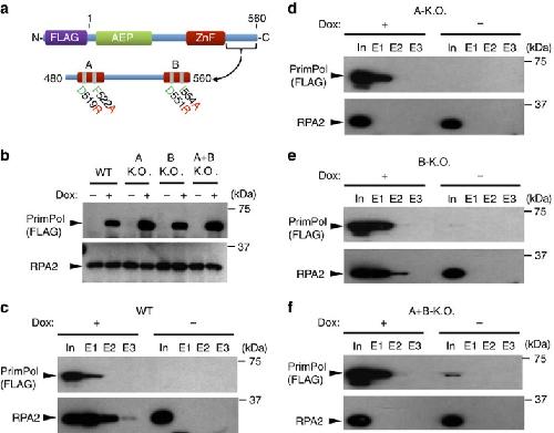 Figure 4. PrimPol RBM-A is critical for RPA-binding in vivo.(a) Schematic detailing the domain architecture of N-terminal FLAG-tagged PrimPol transfected into HEK-293 derivative cells (Flp-In T-Rex-293). The RBD (480â560) containing the RBM-A and B sites is shown below with the mutations forming the A-KO (D519R and F522A) and B-KO (D551R and I554A) highlighted. (b) Flp-In T-Rex-293 cells were transfected with wild-type and RBM-A and B mutated PrimPol. Expression was confirmed by addition of 10ângâmlâ1 doxycycline (indicated by Dox ± on figure) for 24âh and subsequent western blotting. (c) Flp-In T-Rex-293 cells transfected with FLAG-tagged wild-type (WT) PrimPol were grown in the presence or absence of doxycycline (10ângâmlâ1, 24âh), FLAG-PrimPol was immunoprecipitated from the soluble cell lysate using anti-FLAG antibody and western blotted for PrimPol (anti-FLAG) and RPA (anti-RPA2). The presence and absence of doxycycline is indicated by ± Dox, âIn' indicates the input, âE1', âE2' and âE3', indicate elutions 1, 2 and 3, respectively. (d) Immunoprecipitation of FLAG-PrimPolA-KO (D519R/F522A) from Flp-In T-Rex-293 cells grown in the presence and absence of doxycycline. (e) Immunoprecipitation of FLAG-PrimPolB-KO (D551R/I554A) from Flp-In T-Rex-293 cells grown in the presence and absence of doxycycline. (f) Immunoprecipitation of FLAG-PrimPolA+B-KO (D519R/F522A and D551R/I554A) from Flp-In T-Rex-293 cells grown in the presence and absence of doxycycline. |
