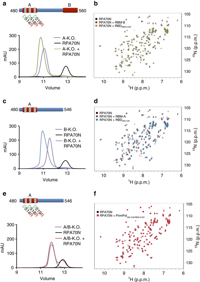 Figure 3. RPA70N dynamically interacts with both RBM-A and RBM-B.(a) Mutation of RBM-A does not abolish binding of PrimPol's RBD to RPA70N. Chromatographs showing the retention volumes of RBDA-KO (purple), RPA70N (black) and RBDA-KO with RPA70N in a 1:1 ratio (green). (b) 15N-1H HSQC spectra showing RPA70N alone (black), in the presence of twofold molar excess of either RBDA-KO (green) or RBM-B peptide (residues 542–560) (red). The perturbations observed for RBDA-KO are similar to those induced by the RBM-B peptide. (c) Truncation of RBM-B does not prevent binding of PrimPol's RBD to RPA70N. Chromatographs showing the retention volumes of RBDB-KO (purple), RPA70N (black) and RBDB-KO with RPA70N in a 1:1 ratio (blue). (d) 15N-1H HSQC spectra showing RPA70N alone (black) or in the presence of twofold molar excess of RBDB-KO (blue) or RBM-A peptide (residues 510–528) (red). The perturbations observed for RBDB-KO are similar to those induced by the RBM-A peptide. (e) Mutation of both RBM-A and RBM-B abolishes the binding of PrimPol's RBD to RPA70N. Chromatographs showing the retention volumes of RBDA/B-KO (purple), RPA70N (black) and RBDA/B-KO with RPA70N in a 1:1 ratio (red). (f) 15N-1H HSQC spectra showing RPA70N alone (black) or in the presence of twofold molar excess of RBDA/B-KO (red). The near identity of the two spectra indicates there is no interaction. |