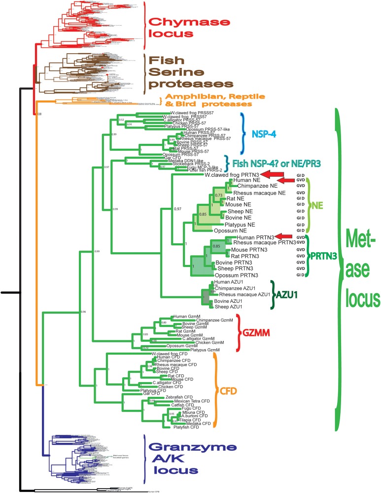 Figure 1. Phylogenetic analysis of the hematopoietic serine proteases. A phylogenetic tree of a large number of different vertebrate hematopoietic serine proteases using the MrBayes program. The proteases encoded within the metase locus are enlarged and highlighted and the three proteases analyzed in this communication, hNE, hPR-3, and Xenopus PR-3 are marked by red arrows. |