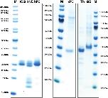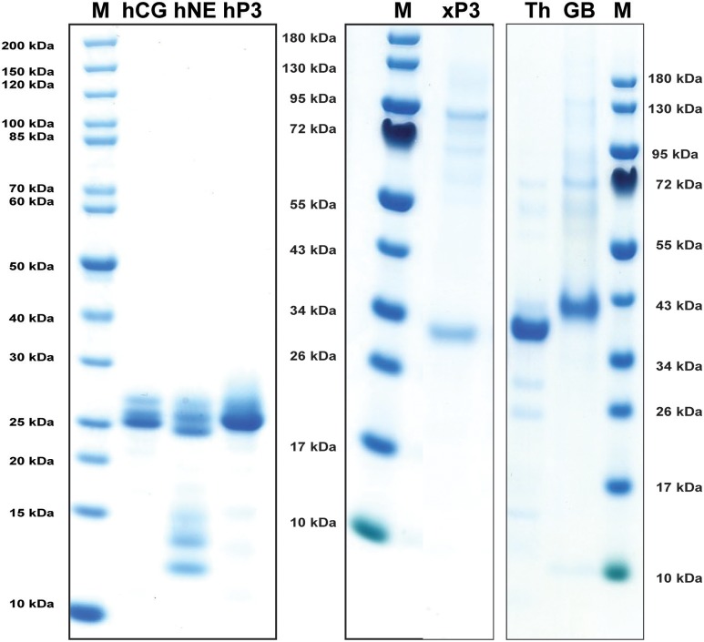 Figure 2. Analysis of the purified hNE, hPR-3, hCG, Xenopus PR-3, human thrombin (Th) and human granzyme B (GB) used in the chromogenic substrate assay and in the determination of the extended cleavage specificity. The three human neutrophil enzymes were commercial preparations purified from peripheral blood neutrophils. The Xenopus PR-3 was produced in the human cell line HEK293-EBNA. The xPR-3 proenzyme was first purified on Ni-NTA beads (–EK) and then activated by removal of the His6-tag by enterokinase digestion (+EK). The enzymes were analyzed by separation on SDS-PAGE and visualized with Coomassie Brilliant Blue staining. |