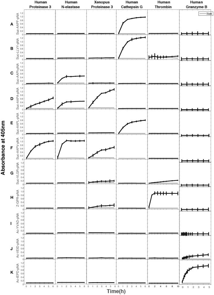Figure 3. Chromogenic substrate assay. (AâK) A panel of different chromogenic substrates was used to determine the primary specificity of hNE, HPR-3, xPR-3, hCG, human granzyme B, and human thrombin. The panel included different chymase, elastase, tryptase and aspase substrates. The amino acid sequences of the substrates are listed on the left side of the figure. Human thrombin, hCG, and human granzyme B were included as reference enzymes for tryptase, chymase, and asp-ase activities, respectively. |