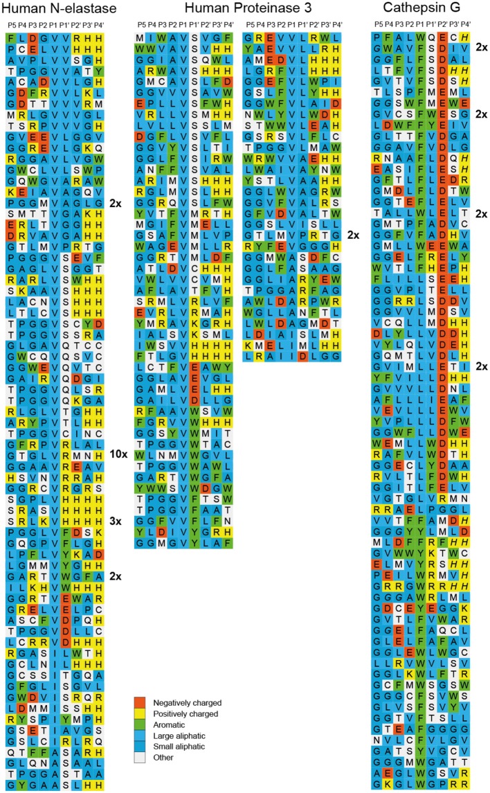 Figure 4. Phage displayed nonamers susceptible to cleavage by hNE, hPR-3 and hCG after five biopannings. After the last selection step, phages released by proteolytic cleavage of the three proteases were isolated and the sequences encoding the nonamers were determined. The general sequence of the T7 phage capsid proteins are PGG(X)9HHHHHH, where (X)9 indicates the randomized nonamers. The protein sequences were aligned into a P5-P4′ consensus, where cleavage occurs between positions P1 and P1′. Sequences occurring more than once are marked by the corresponding number to the right of the sequence. The aa are color coded according to the side chain properties as indicated in the legend. |