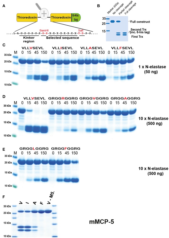 Figure 5. Analysis of the cleavage specificity of hNE by the use of recombinant protein substrates. (A) Shows the overall structure of the recombinant protein substrates used for analysis of the efficiency in cleavage by the different enzymes in Figures 5â10. In these substrates two thioredoxin (trx) molecules are positioned in tandem and the adjacent trx has a His6-tag positioned in its C terminus. The different cleavable sequences are inserted in the linker region between the two trx molecules by the use of two unique restriction sites, one Bam HI and one Sal I site, which are indicated in A. (B) A hypothetical cleavage is shown to highlight possible cleavage patterns. (CâE) Cleavage of recombinant substrates by hNE at different enzyme concentrations (50 or 500 ng). The name and sequence of the different substrates are indicated above the pictures of the gels. The time of cleavage in minutes is also indicated above the corresponding lanes of the different gels. The uncleaved substrates have a molecular weight of ~25 kDa and the cleaved substrates appear as two closely located bands with a size of 12â13 kDa. The cleavage of a panel of substrates with a more strict elastase, as represented by mouse mast cell protease 5, was included in (F). |