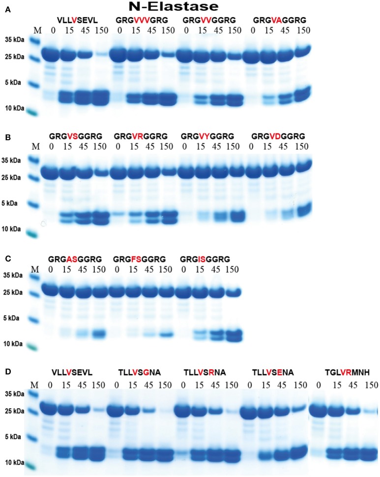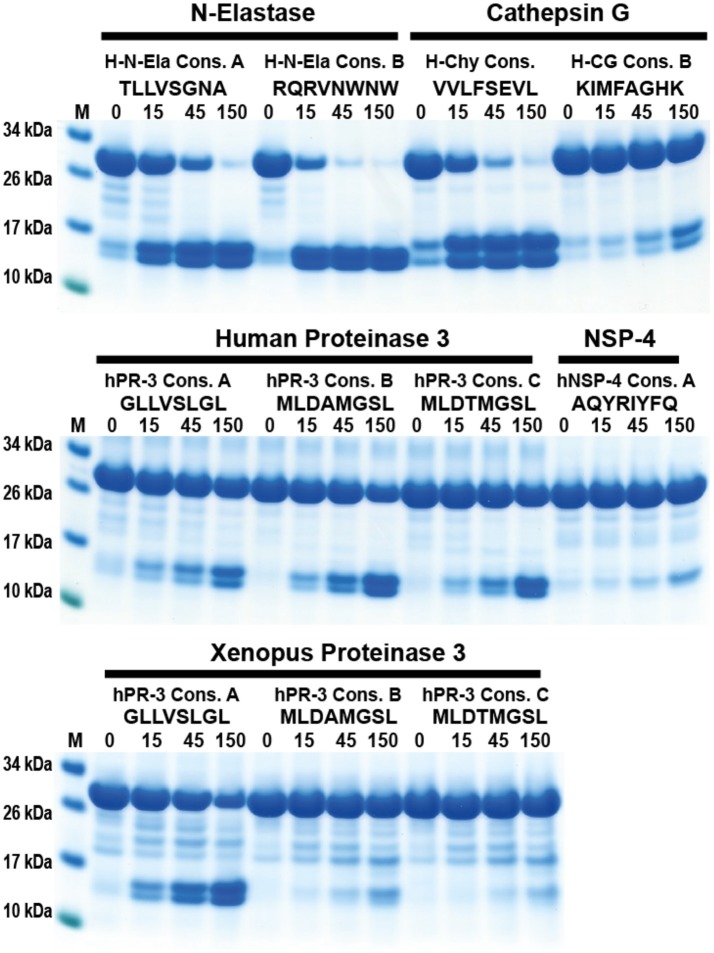 Figure 6. Analysis of the cleavage specificity of hNE by the use of recombinant protein substrates. (A–D) Shows the cleavages of a number of substrates by hNE. The sequences of the different substrates are indicated above the pictures of the gels. The time of cleavage in minutes is also indicated above the corresponding lanes of the different gels. The uncleaved substrates have a molecular weight of ~25 kDa and the cleaved substrates appear as two closely located bands with a size of 12–13 kDa. |