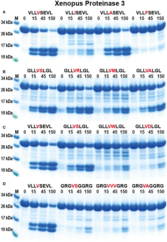 Figure 8. Analysis of the cleavage specificity of Xenopus PR-3 by the use of recombinant protein substrates. (A–D) Shows the cleavages of a number of substrates by hPR-3. The sequences of the different substrates are indicated above the pictures of the gels. The time of cleavage in minutes is also indicated above the corresponding lanes of the different gels. The uncleaved substrates have a molecular weight of ~25 kDa and the cleaved substrates appear as two closely located bands with a size of 12–13 kDa. |