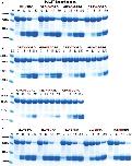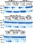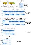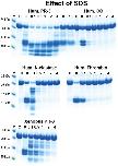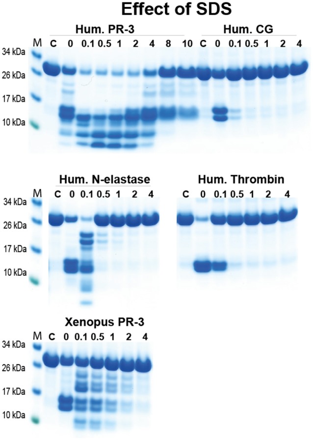 Figure 9. Analysis of the effect of different concentrations of SDS on the cleavage efficiency by five different enzymes, hPR-3, hNE, hCG, human thrombin and xPR-3. Consensus substrate sequences for the different enzymes were inserted in the 2x Trx substrates as shown in Figure 5. These substrates were then were used to analyze the effect of different SDS concentration on the cleavage efficiency by the five different enzymes. We used the substrate (VLLVSEVL) for hNE, the substrate (VLLFSEVL) for hCG, the substrate (VLLVSEVL) for hPR-3, the substrate (LTPRGVRL) for human thrombin and the substrate (VLLVSEVL) for Xenopus PR-3. Lane C for the different enzymes is a control without SDS. The concentrations of the SDS are then listed above the corresponding lane from 0.1 to 8%. The uncleared substrates have a molecular weight of ≈25 kDa and the cleaved substrates appear as two closely located bands with a size of 12–13 kDa. Due to the effect of the SDS to open the protein structure of the Trx molecules cleavage also occur within the Trx molecules, which results in additional bands of different molecular weights. |