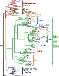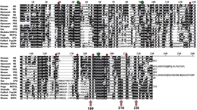 Figure 11. Alignment of a panel of NE, PR-3, and NSP-4 sequences. The sequences of a panel of NSP-4, NE, and PR3 sequences from mammals and amphibians were aligned using the Clustal W algorithm in the DNASTAR program together with a small subfamily of fish proteases that cluster between NSP-4 and NE and PR-3 in the phylogenetic tree shown (from Figure 1). The conserved cysteines are marked with red dots and the three residues of the catalytic triad, His-Asp-Ser, with larger green dots. The three residues with positions 189, 216, and 226 in bovine chymotrypsin are marked with purple arrows. These three residues, are in many trypsin related serine proteases, located in the bottom and the sides of the pocket of the protease where the P1 residue of the substrate is positioned upon cleavage. |