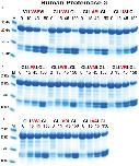 Figure 7. Analysis of the cleavage specificity of hPR-3 by the use of recombinant protein substrates. (A–C) Shows the cleavages of a number of substrates by hPR-3. The sequences of the different substrates are indicated above the pictures of the gels. The time of cleavage in minutes is also indicated above the corresponding lanes of the different gels. The uncleaved substrates have a molecular weight of ~25 kDa and the cleaved substrates appear as two closely located bands with a size of 12–13 kDa. |